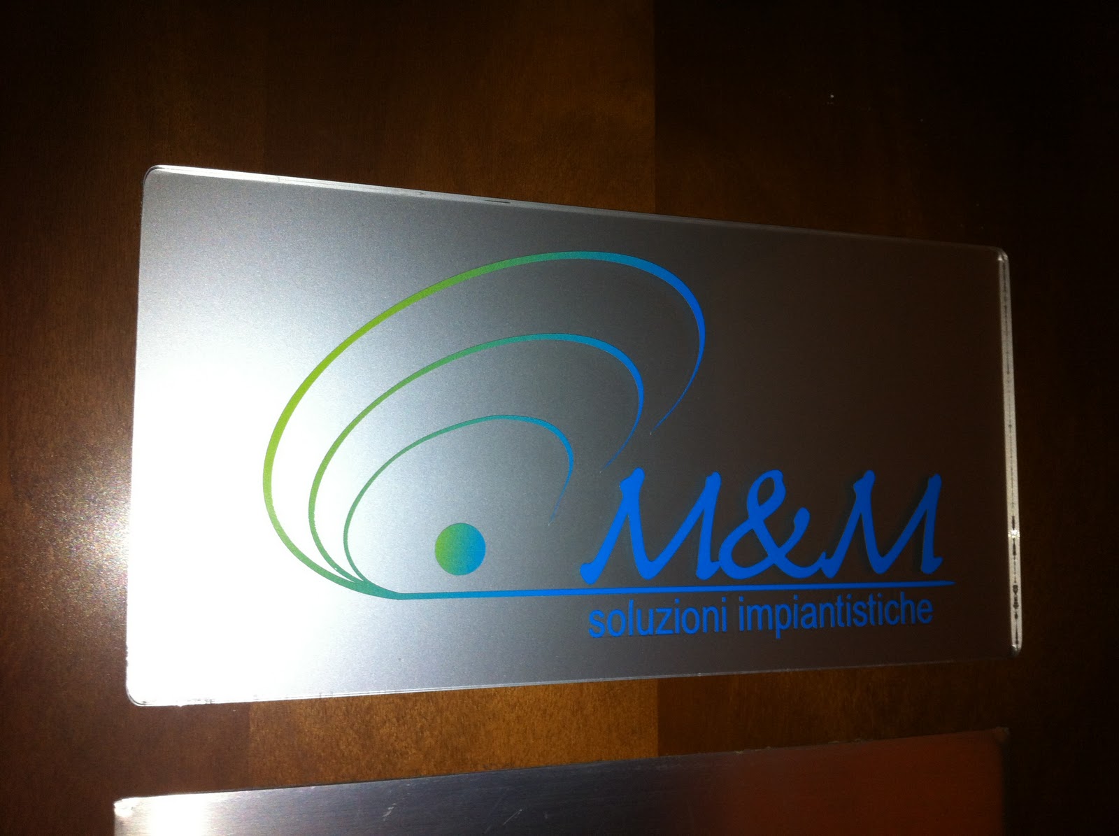Targa in plexiglas colato spessore 5 mm, angoli raggianti 5 mm, bordo filo lucido, pellicola intaglio posteriore colore argento e personalizzazione con intaglio stampato.